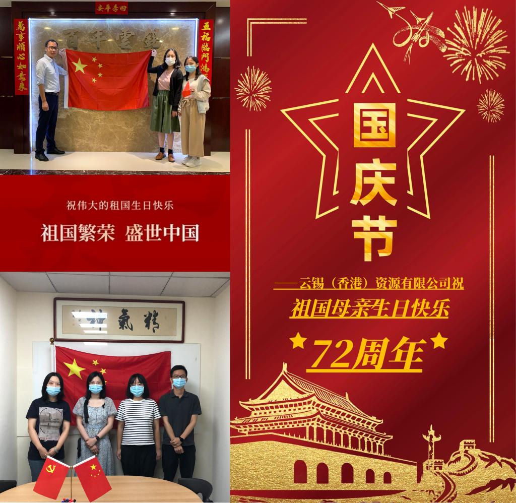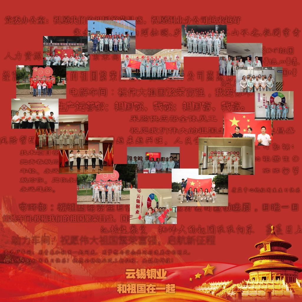 机关第一党支部:金秋十月,举国同庆;神州大地,繁花似锦;家和国盛,乐曲如潮。祖国风雨数十载,中华儿女齐奋进,在此,祝祖国母亲生日快乐,繁荣富强。祝福云锡更上一层楼。
