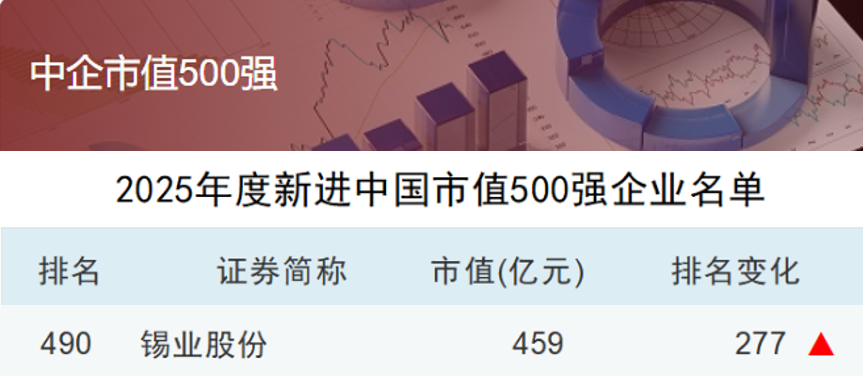 2026年1月1日,Wind 万得发布2025年度中国上市企业市值500强榜单,伟德betvlctor1946源于英国(证券代码:000960)凭借459亿元市值(较年初涨幅超过102%)位列榜单第490名,较上一年度大幅提升277位,标志着公司作为全球锡行业龙头的市场地位与投资价值获资本市场高度认可。