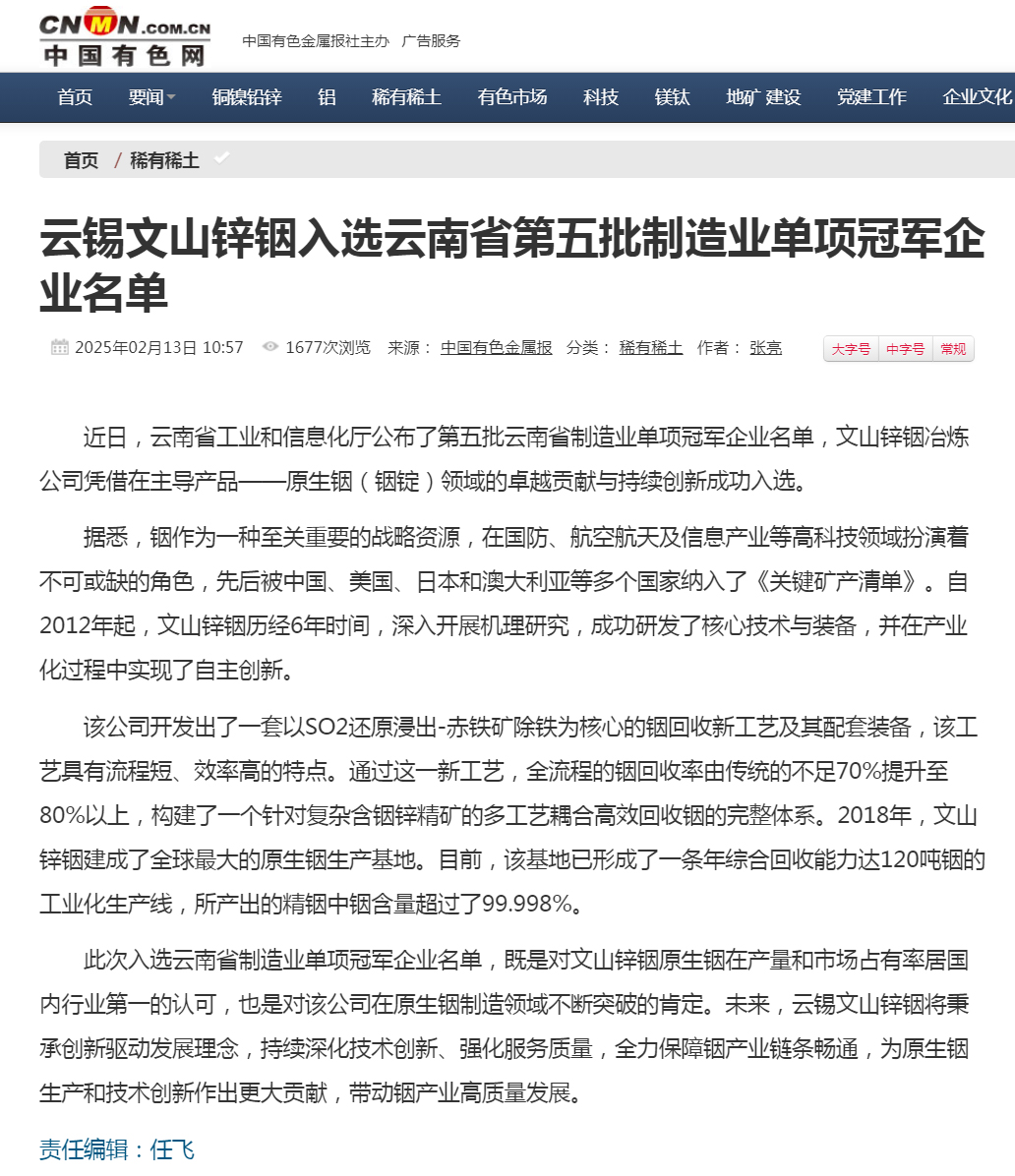 中国有色网:文山锌铟入选云南省第五批制造业单项冠军企业名单