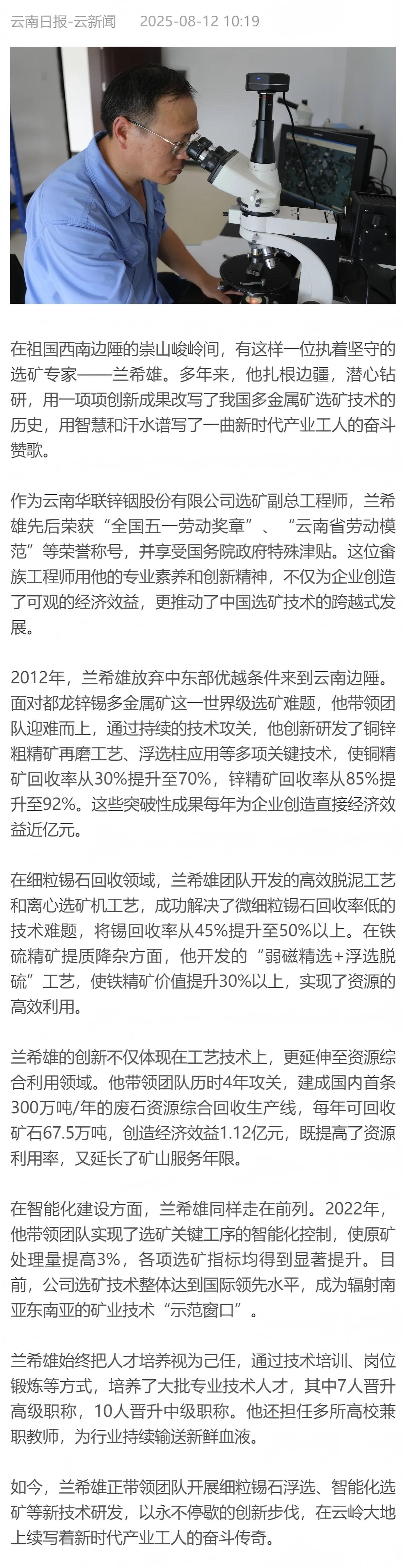 云南日报:全国劳动模范兰希雄——扎根边疆的选矿专家