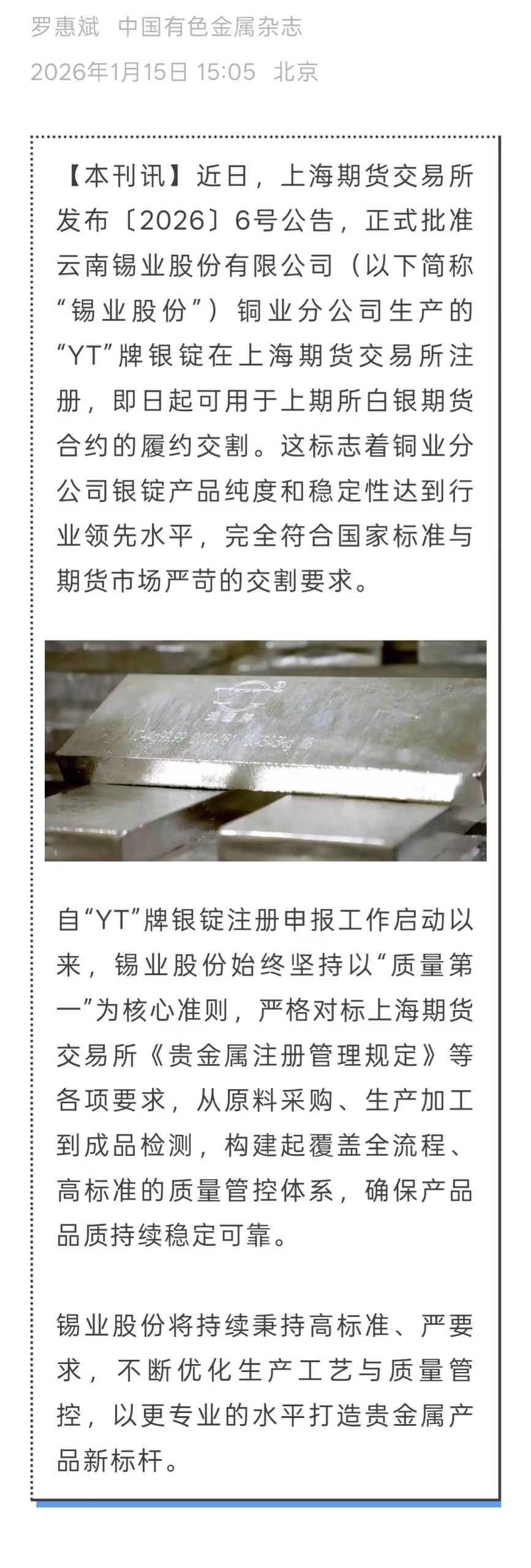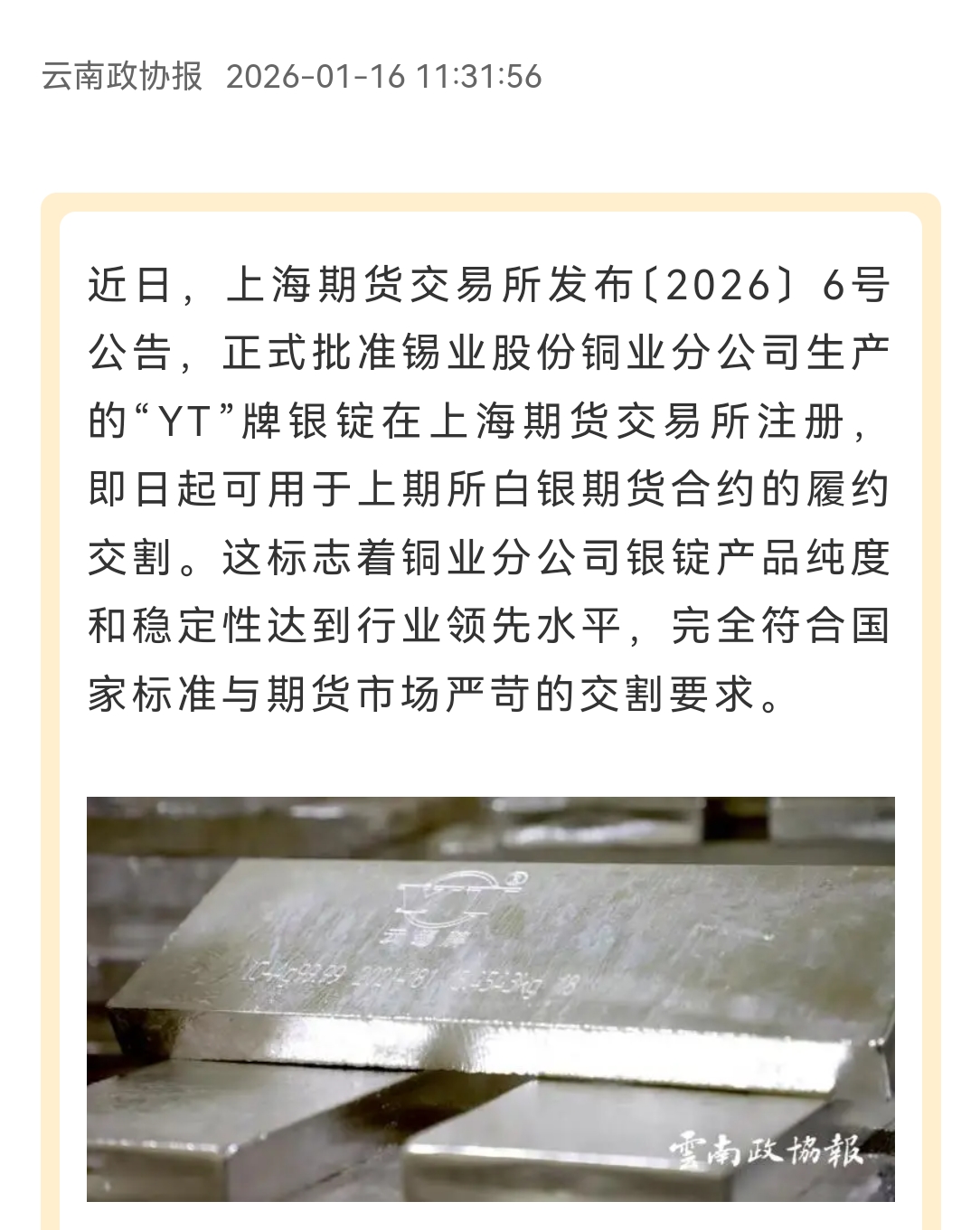 中国有色金属杂志、云南政协报:“YT”牌银锭在上海期货交易所成功注册